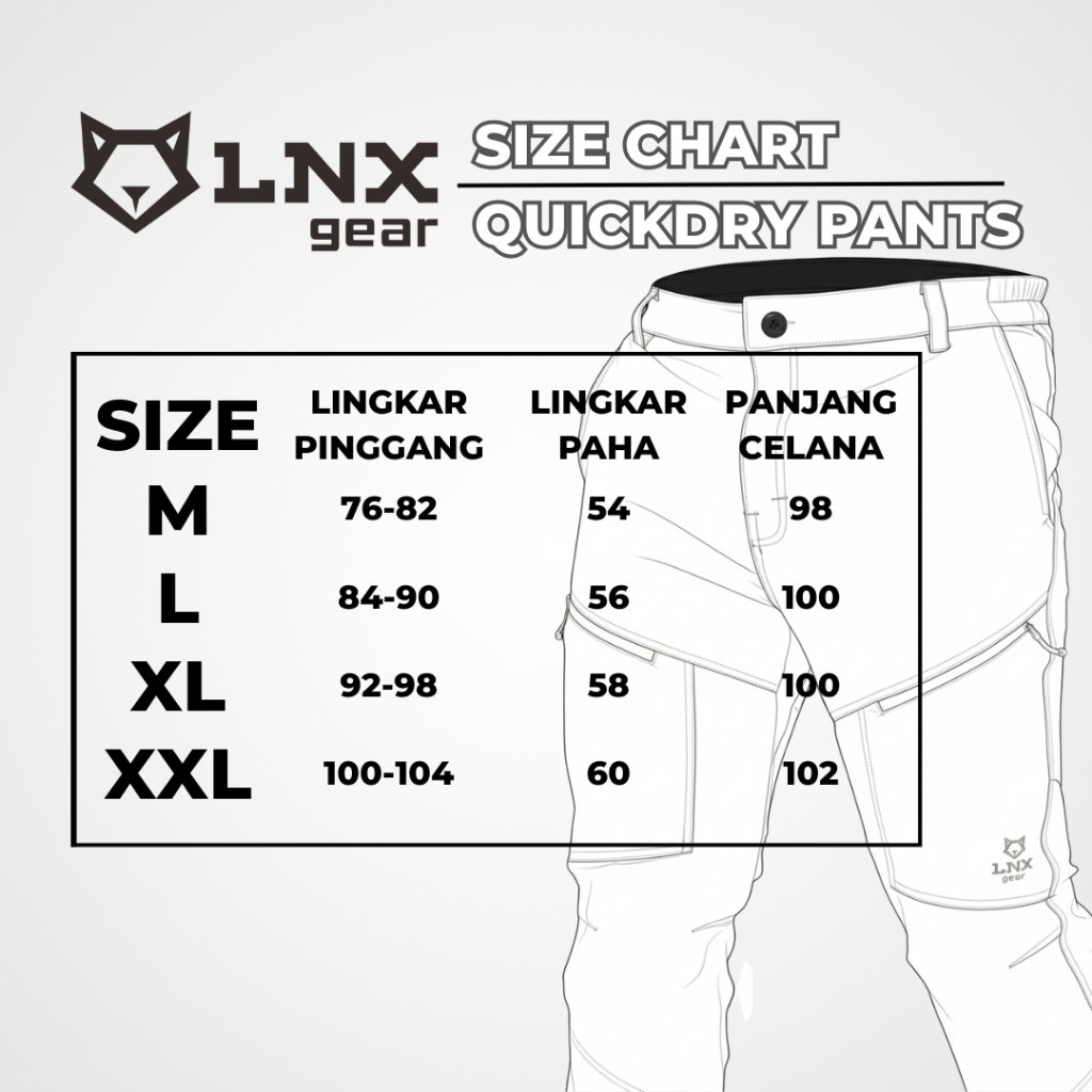 LNX Gear Celana Panjang Outdoor Gunung Quickdry Kalingga Series Quickdry material dan strech, menjadikan celana ini sangat praktis , ringan dan anti bacteri. Dengan 5 Saku untuk keperluaan penyimpanan yang efektif dan lebih lebar SPESIFICATIONS : * 2 Side Pocket * 2 Front Pocket with Zipper * 1 Back Pocket with Zipper * Embordir Logo * Water Repellent Material * 4 ways stretch Fabrics * Elastic Waist * Reguler Fit Size chart M = Lingkar pinggang : 72cm | Panjang : 96cm L = Lingkar pinggang : 80cm | Panjang : 98cm XL = Lingkar pinggang : 92cm | Panjang : 100cm XXL = Lingkar pinggang :104 | Panjang : 102cm