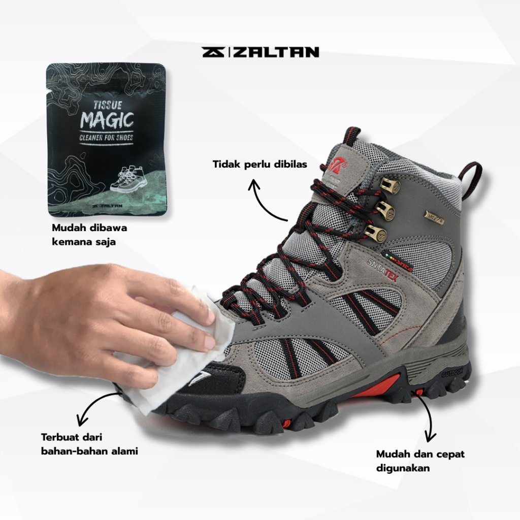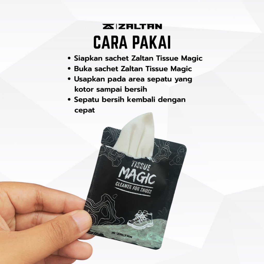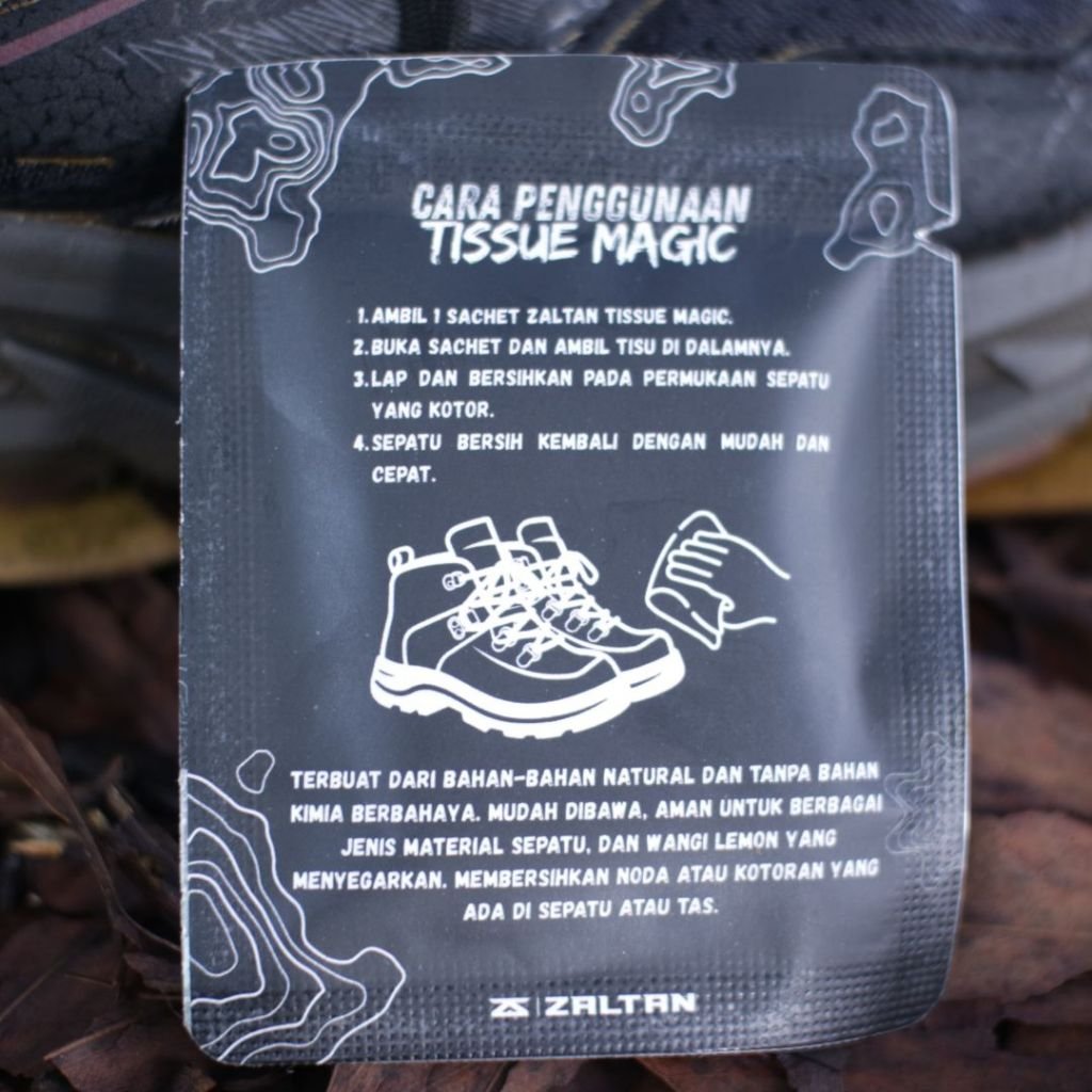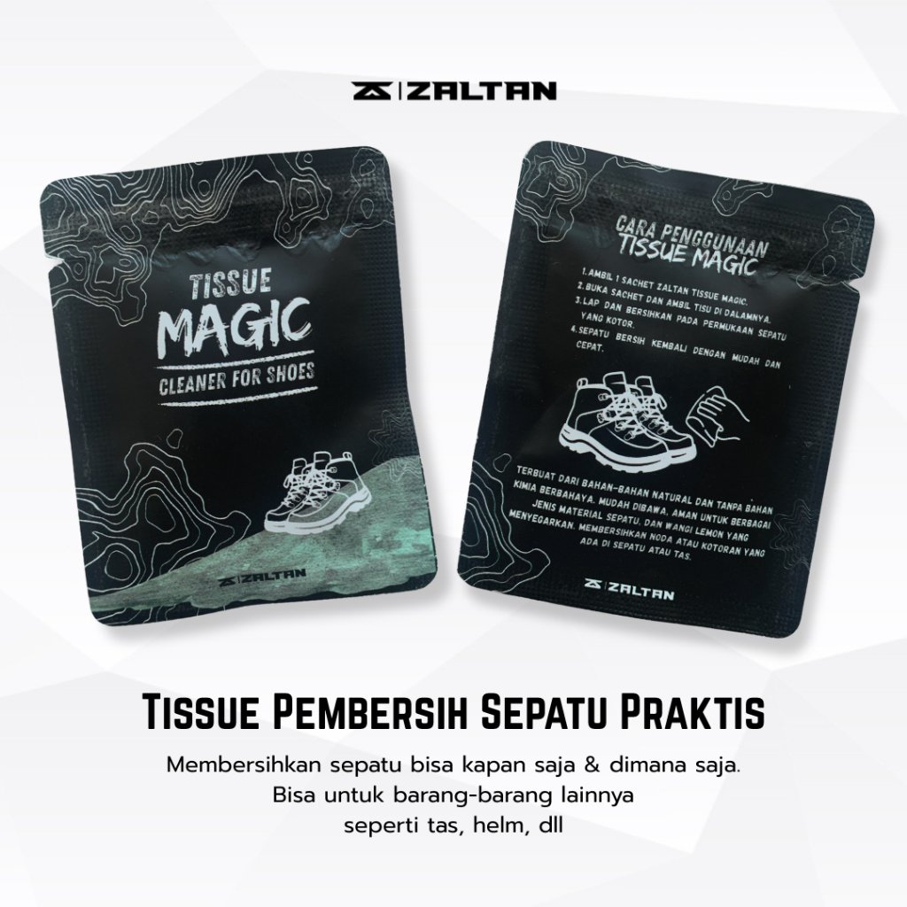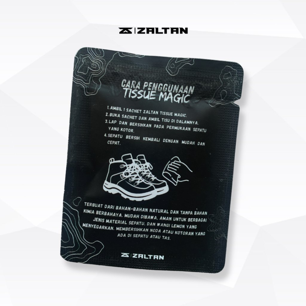 Paket berisi 1 (satu) Sachet Zaltan Wipes (Pembersih Sepatu), masa kadaluarsa : 2 tahun dari tanggal produksi.